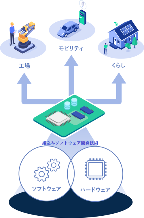 ミラクシアには、半導体開発、ソフトウェア開発、ハードとソフトを繋げるシステム開発で