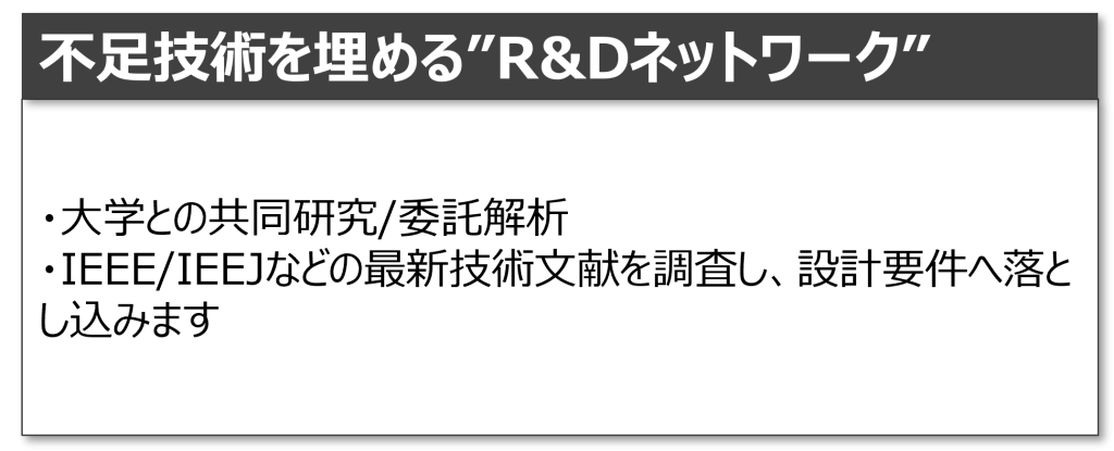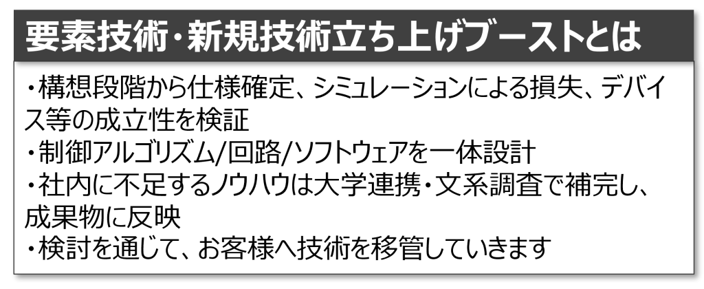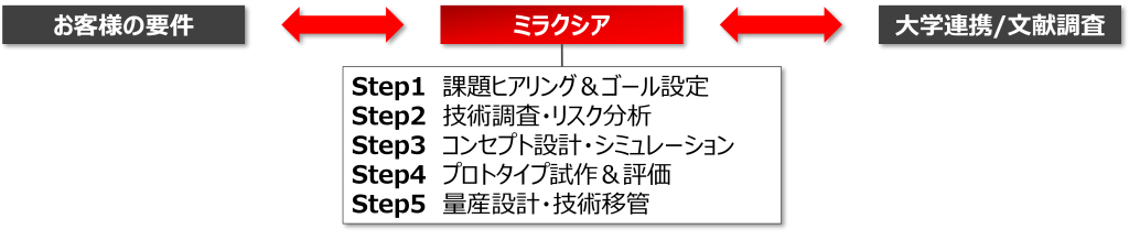 ミラクシアの「要素技術立ち上げブーストサービス」は、ハード設計からデジタル制御ソフト、大学連携による最新知見の取り込みまで、技術導入をワンストップで加速させるサービスです。