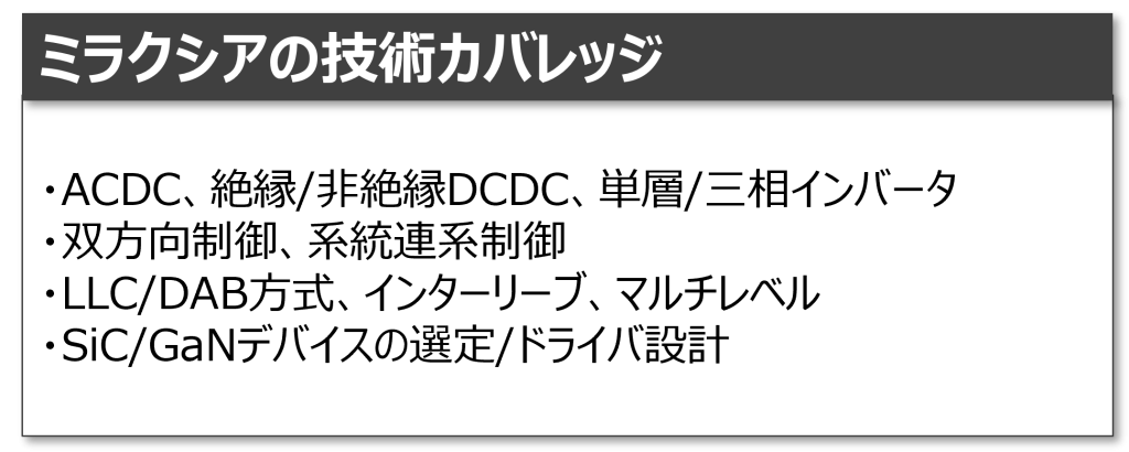 ミラクシアの「デジタルインテグレーションサービス」は、要件定義から MCU 選定、ハード/ソフトの設計インターフェース策定、モデルベース開発・ツールチェーン導入、ドキュメント整備・教育までワンストップで支援し、御社の電源製品に新たな付加価値をもたらします。