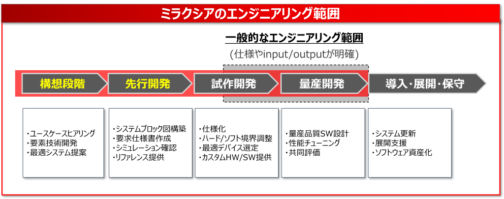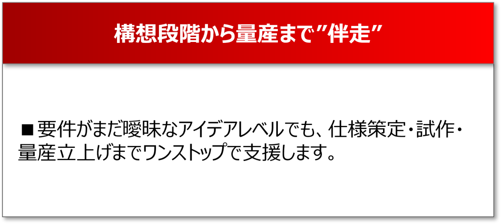 構想段階から、お客様と一緒に「やりたい」を具現化していきます 量産開発・保守・顧客サポートまでお客様に寄り添う幅広い開発サービスが提供可能です