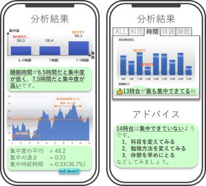 勉強記録、パーソナリティ情報(睡眠時間、場所等)、集中力を分析し、一人ひとりに合った勉強方法をアドバイスします。
