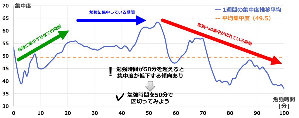 勉強時間が50分を超えると集中力が低下する傾向あり