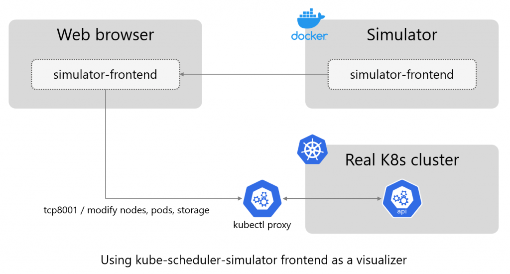 kube-scheduler-simulatorはsimulator-server, simulator-etcd, simulator-frontendの3個のコンテナで動作します。 simulator-frontendはNuxt.jsアプリで、simulator-serverとREST APIで通信します。 このREST APIはオリジナルのK8sと互換性があるので、simulator-frontendを本物のクラスタで動作しているkube-apiserverと接続できます。 これにより本物のクラスタで動作しているスケジューラのローレベルな動作を可視化できるようになります。